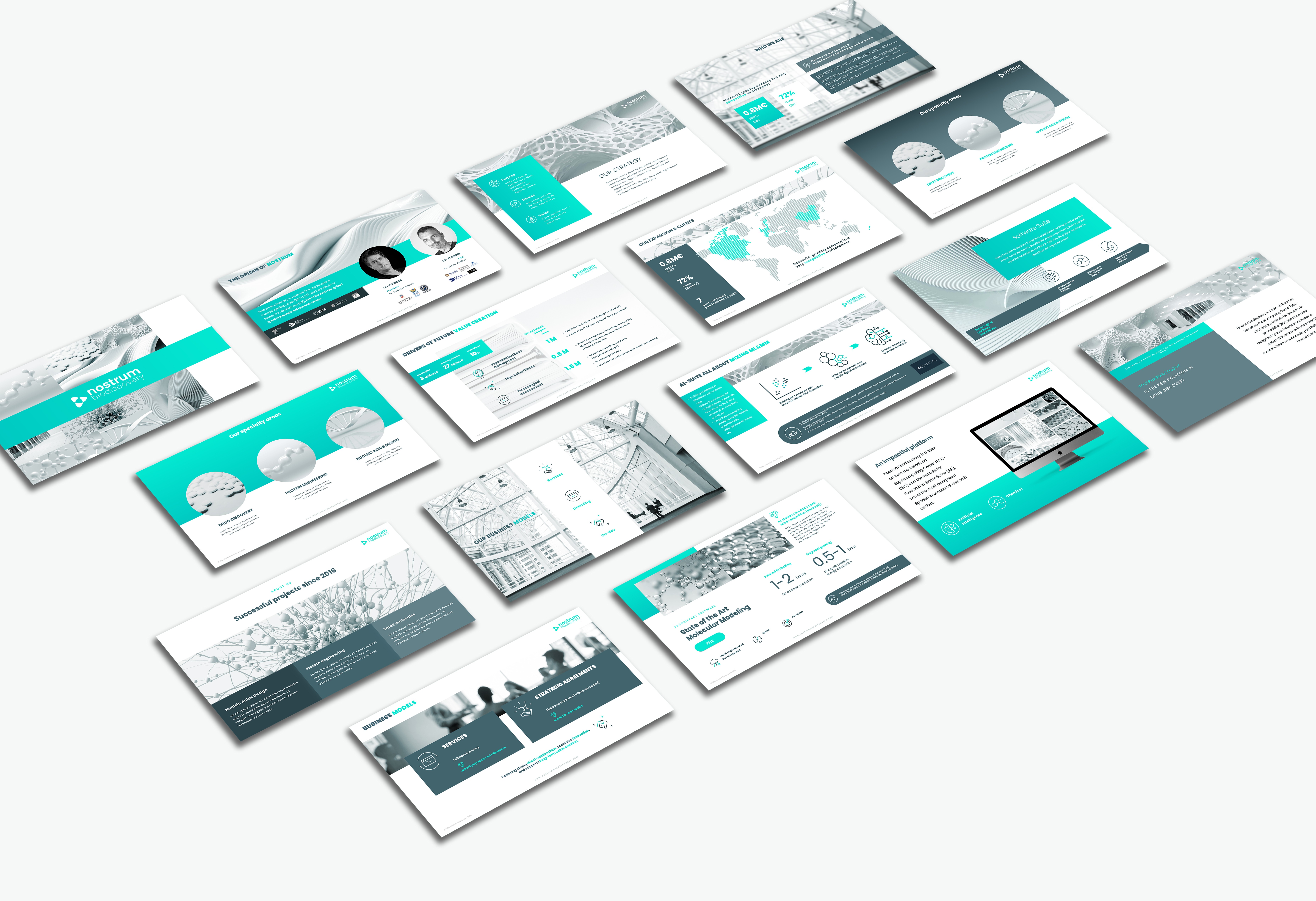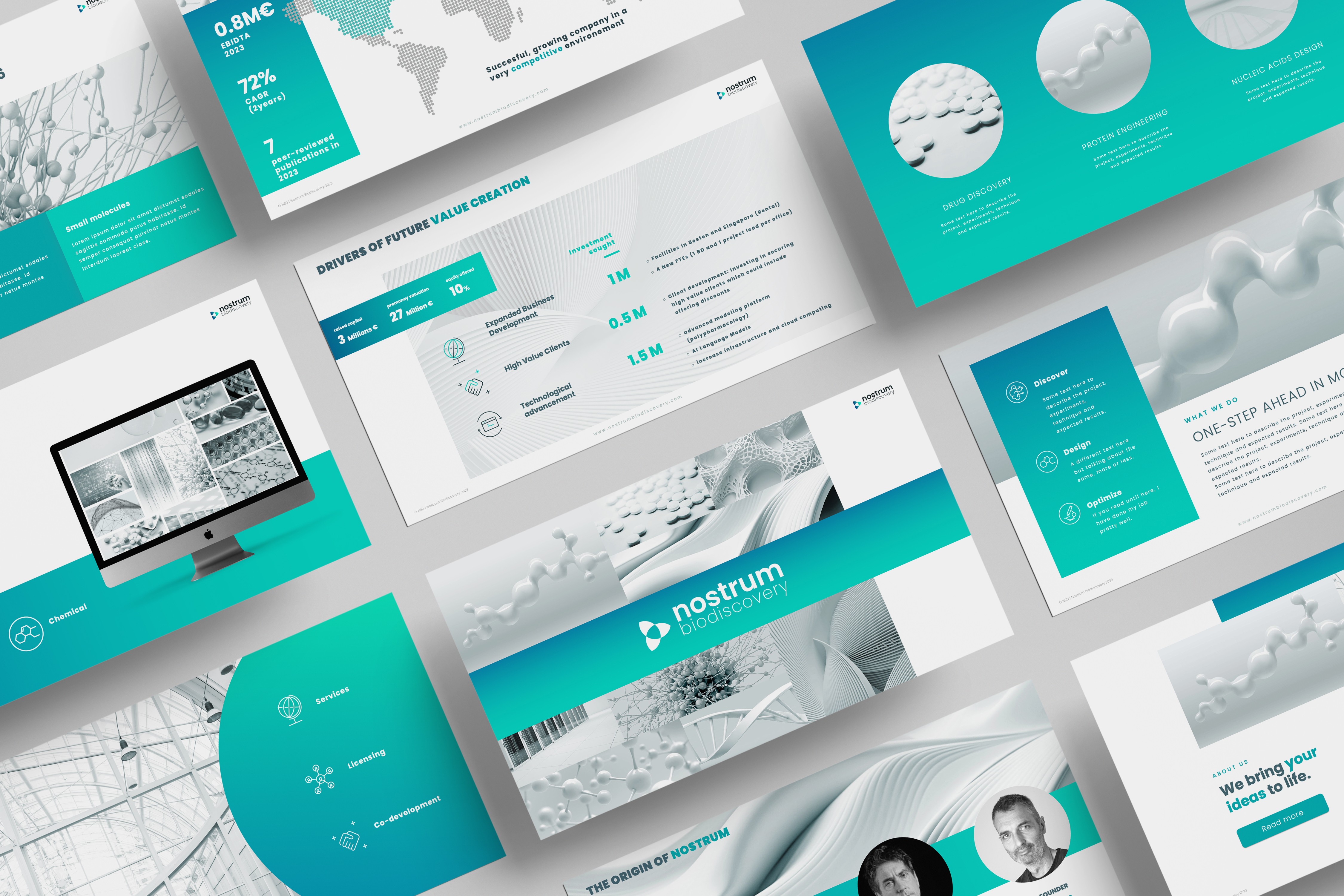 Over the years years, I applied Nostrum’s modernized identity across all key communication tools. From scientific presentations and technical sheets to brochures, business cards, and digital platforms, the brand system ensured consistency and professionalism at every touchpoint. Bright teal accents, black-and-white imagery, and clear layouts brought clarity to complex content while reinforcing credibility with pharma partners, investors, and the wider scientific community.