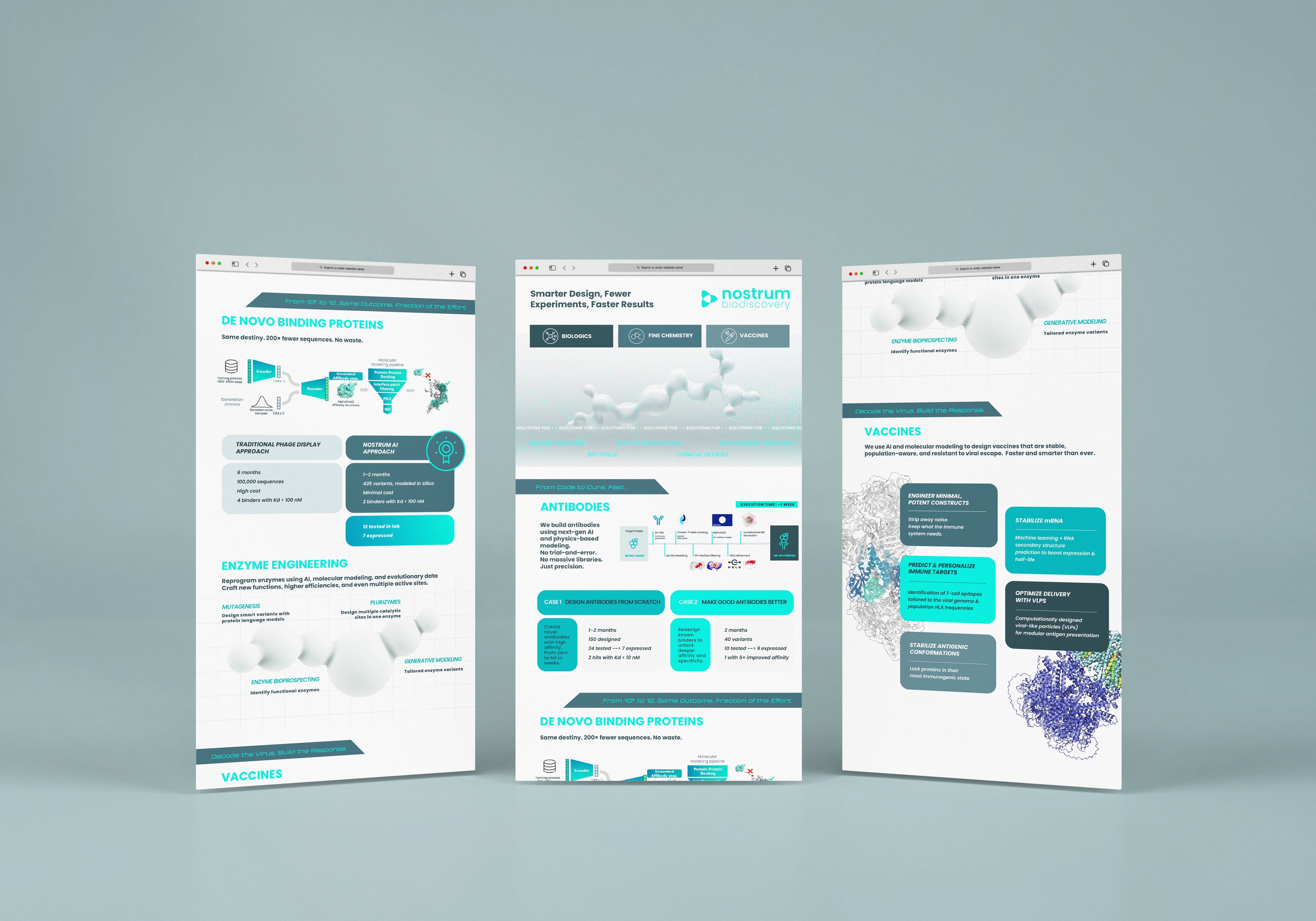 Nostrum needed an identity that would inspire trust in the scientific community while projecting clarity and professionalism for international collaborations. As their Head of Visual Communication, I had to design a system that worked seamlessly across technical, investor, and scientific communication — from research reports to conference booths — without losing brand consistency.